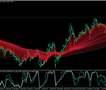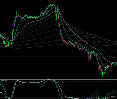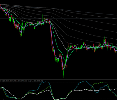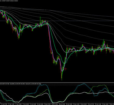 Disparador de entrada a mercado en base a desviación del precio de una serie de medias móviles de distinta envergadura, con confirmación de 3 estocásticos distintos. De esta manera conseguimos muy pocas entradas, pero muy certeras.